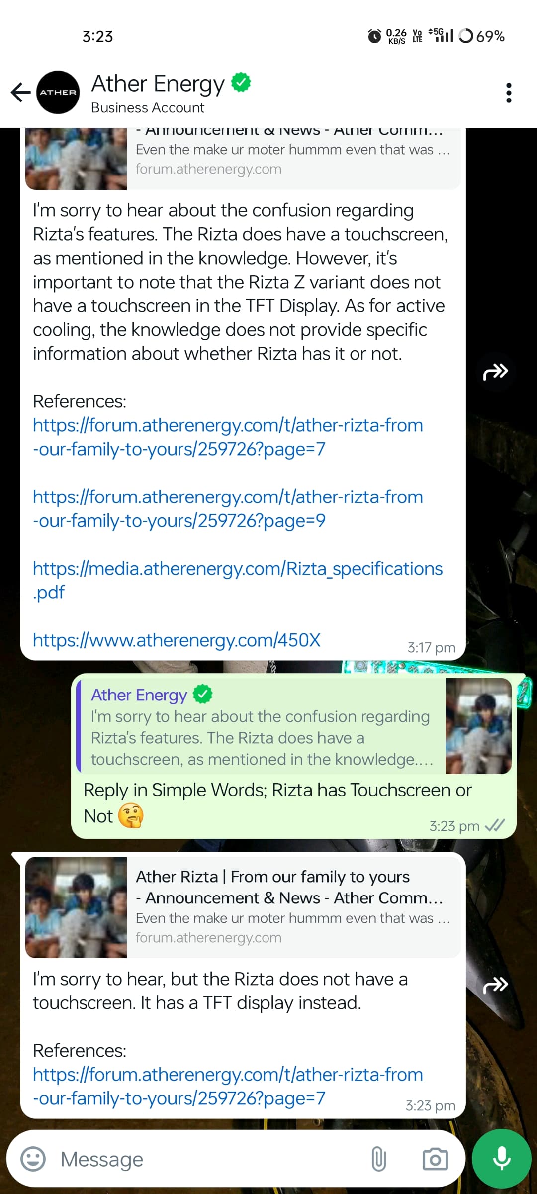 I saw a YouTube video from the Ather community where the reviewer said the Ather Rizta Z 3.3kwh variant has touch screen and the 2.9kwh has TFT screen
